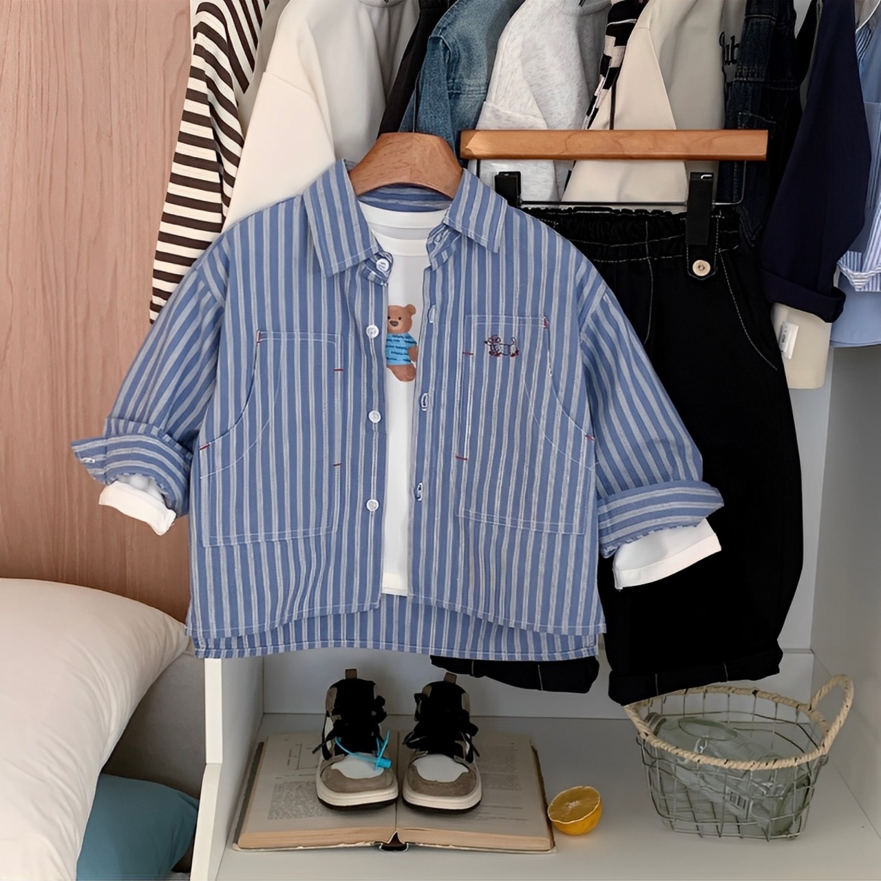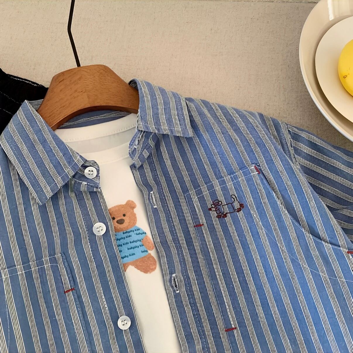 大きめポケットのストライプ柄が魅力のシャツで、シンプルながらスタイリッシュな印象を与えます♪