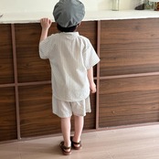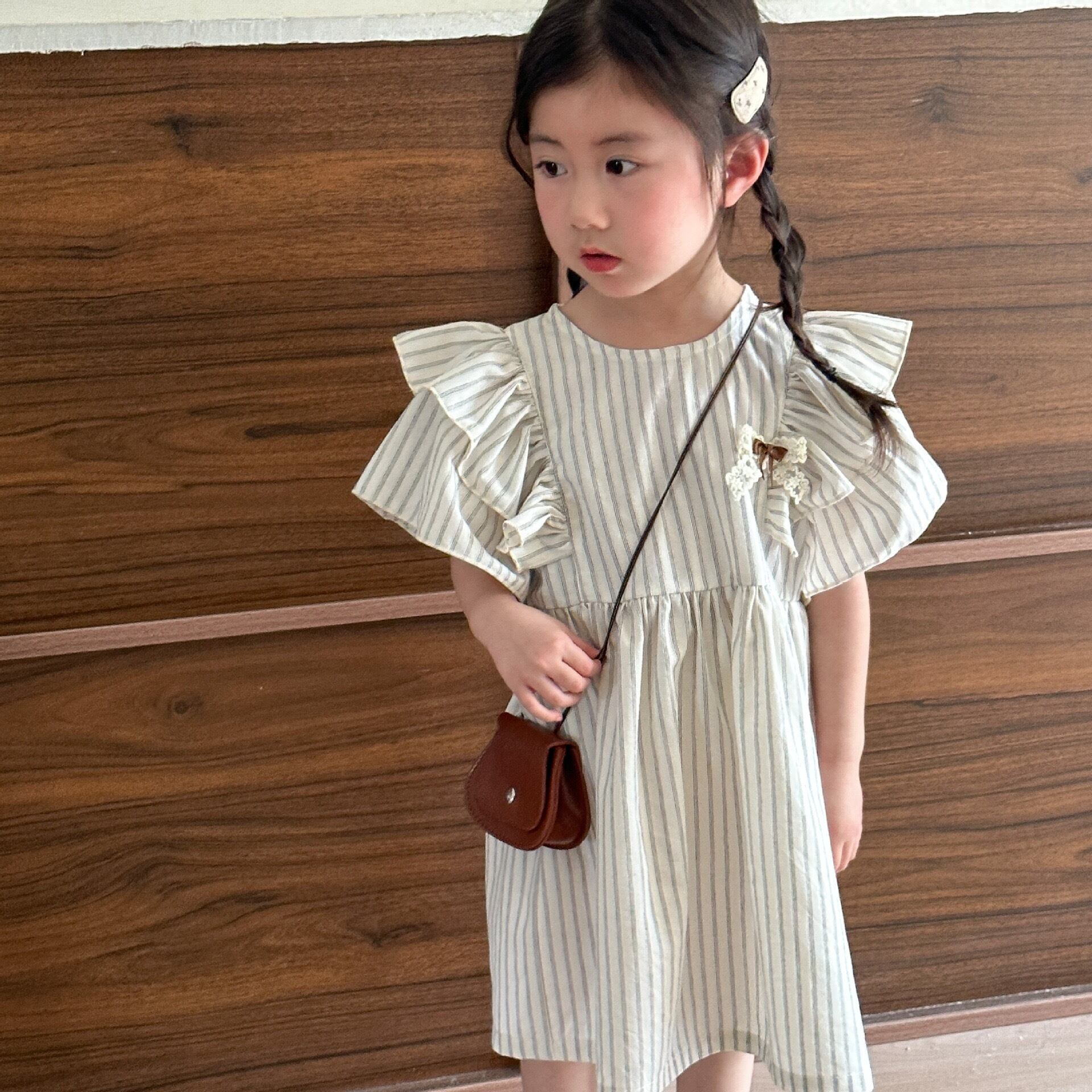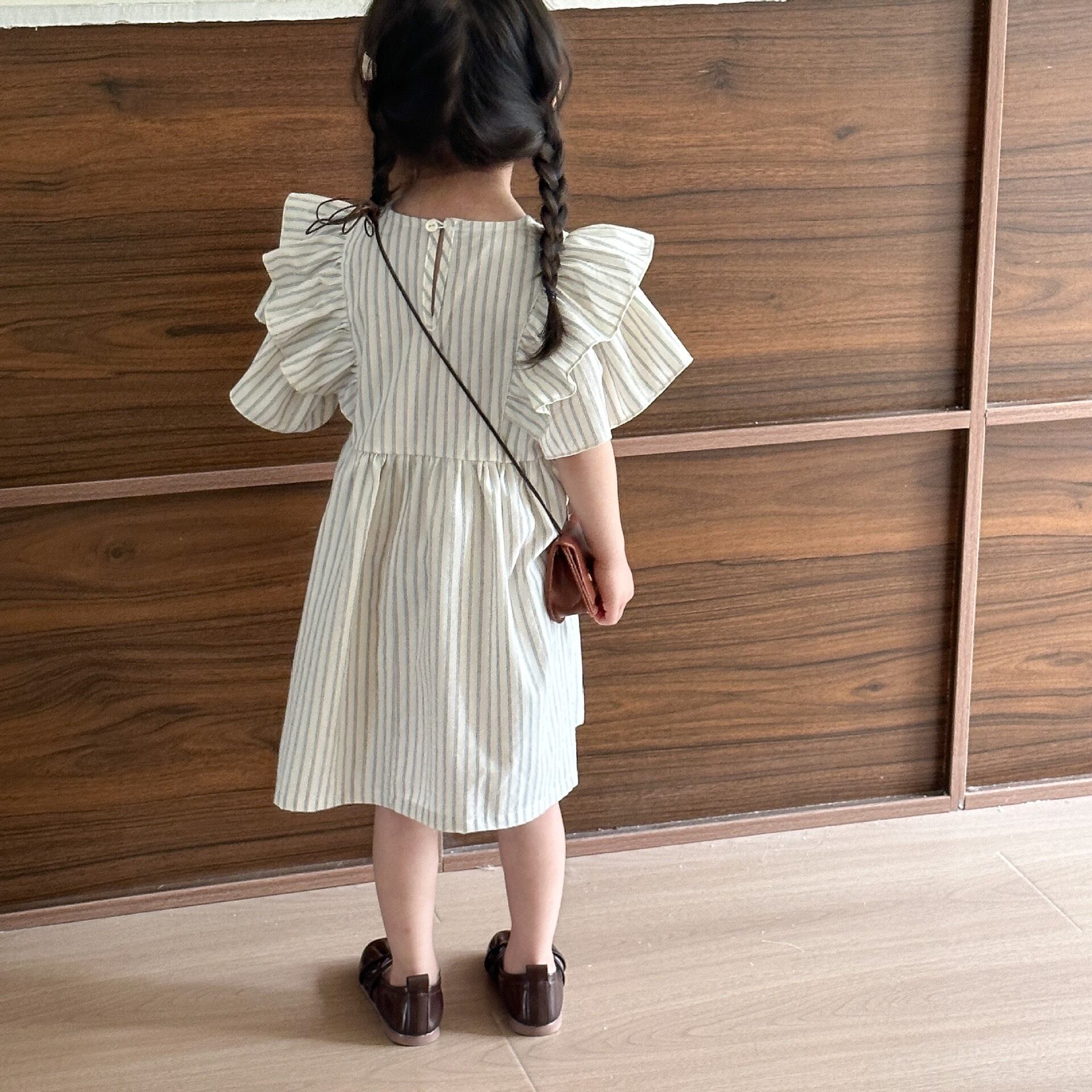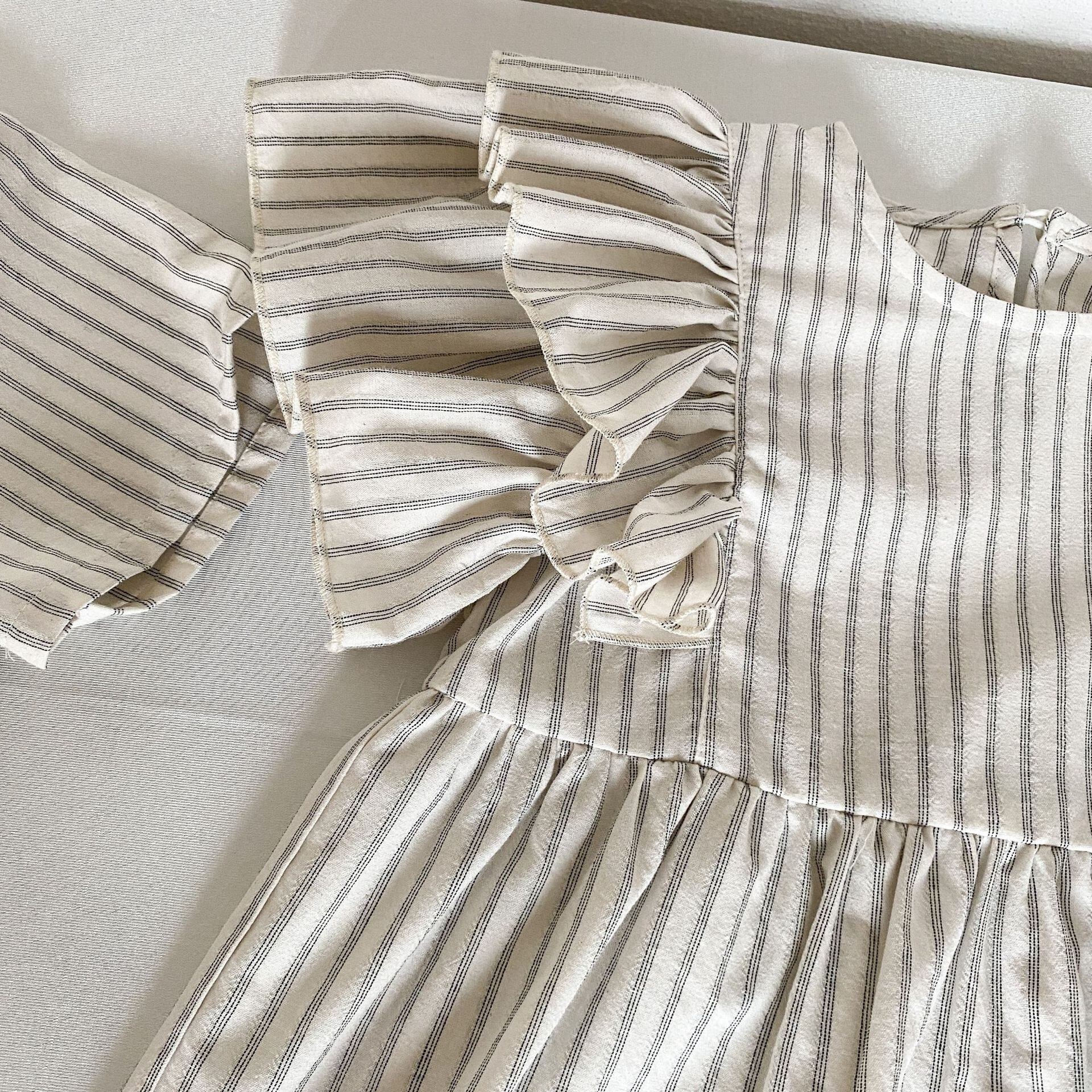 ストライプシャツのセットアップとフリル付ワンピース。