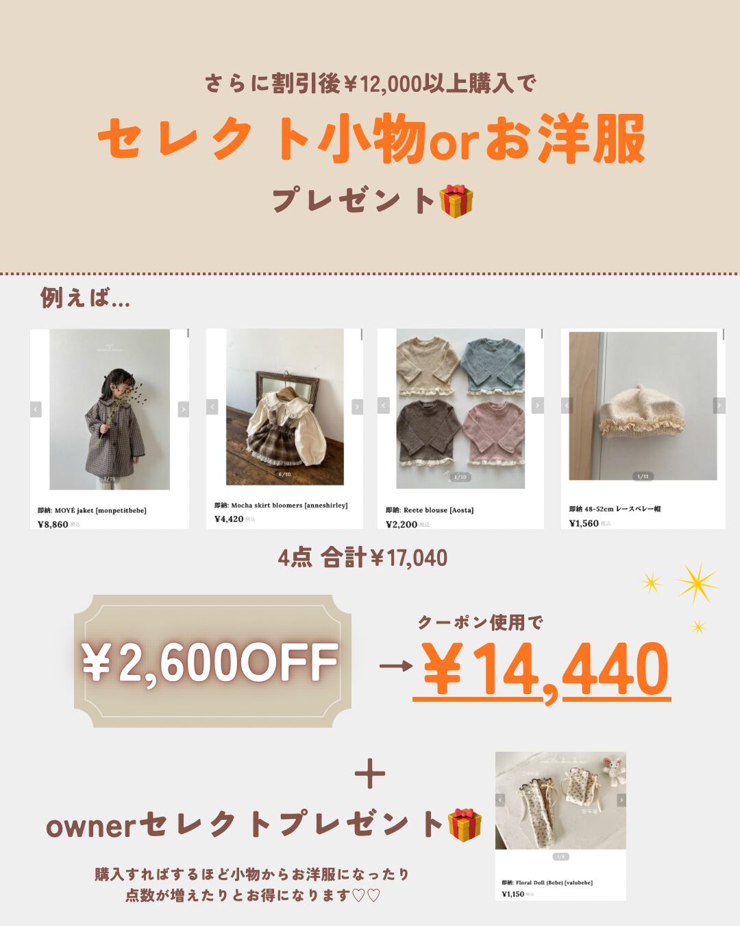 ownerセレクトの小物やお洋服をプレゼント!
